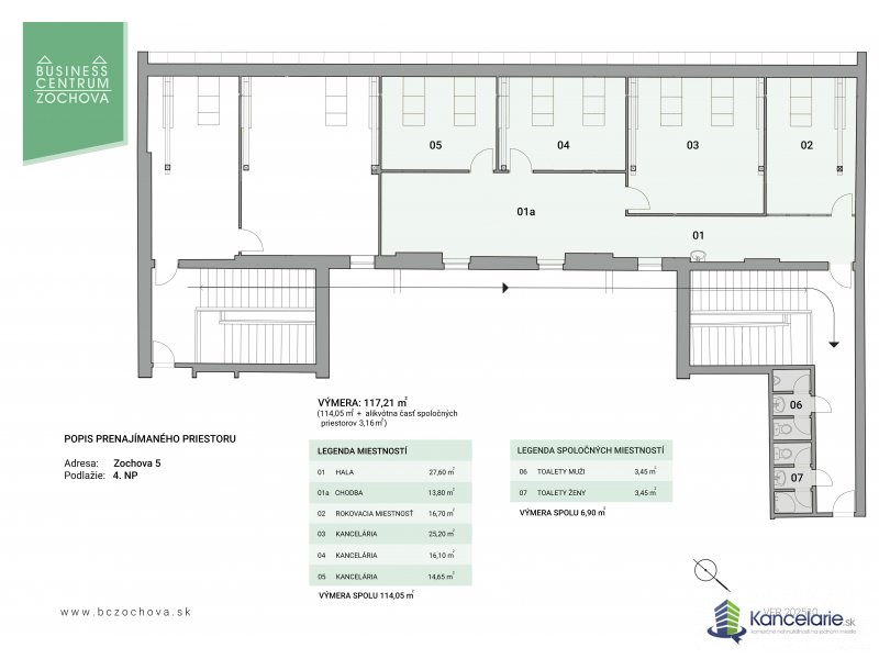 Kancelársky priestor sa nachádza na štvrtom nadzemnom podlaží s výmerou 117,21 m². Kancelársky priestor sa skladá z 4 samostatných kancelárií, z haly, chodby, rokovacej miestnosti a zo zdieľaných toaliet.